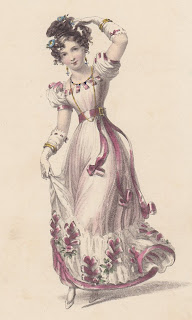 Also from April Ackermann’s is a pink Ball Dress with an appliqued overskirt—perhaps muslin over pink satin?—and puff sleeves decorated with free-standing petals. Her gloves are ruffle-edged (I love these!) and her dancing slippers lace up the ankles, a la ballet shoe. Note the heavily curled hairstyle—common this year and into next: